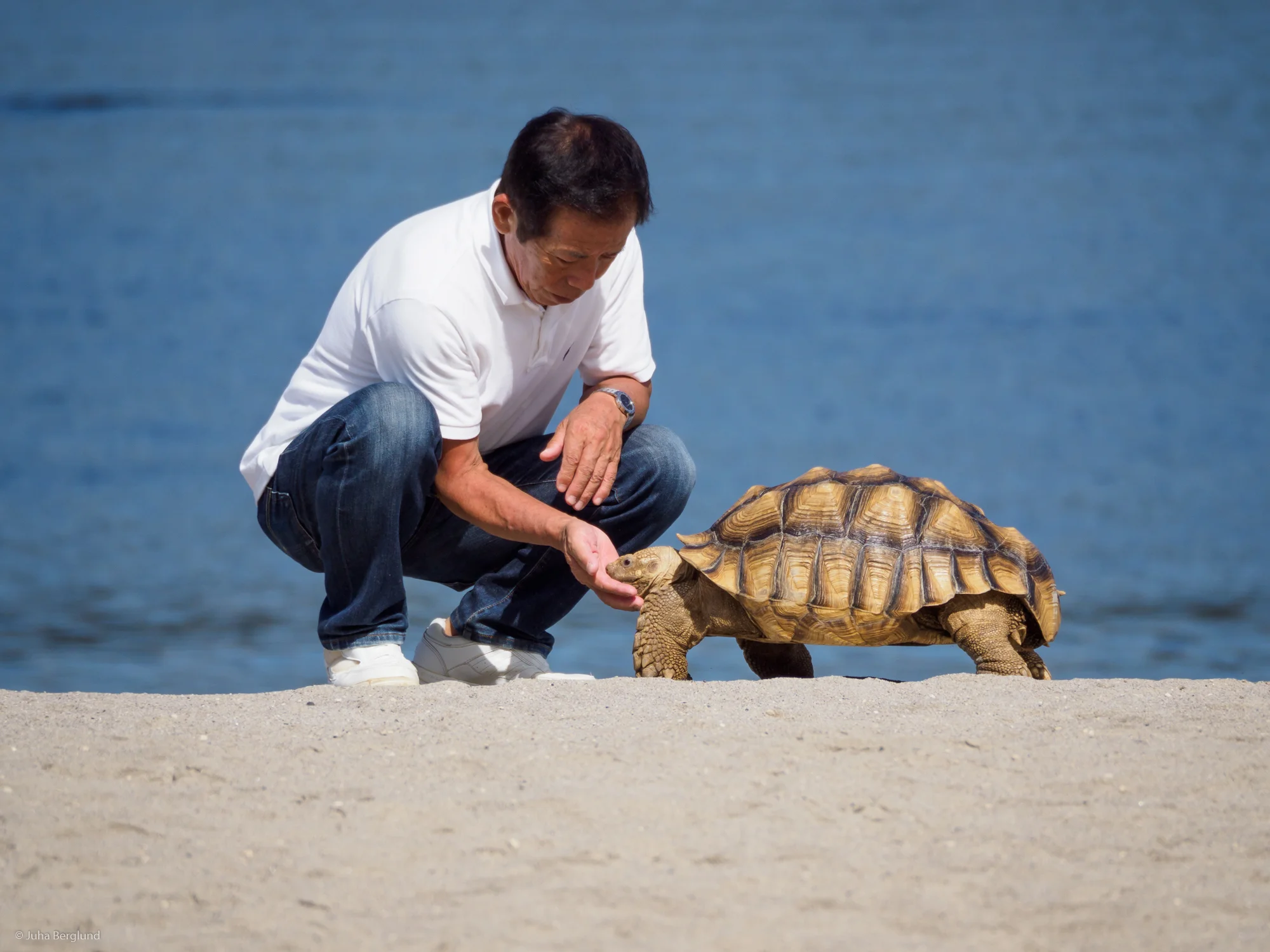 It's a big city so you see all kinds of stuff. This gentleman used a wheelbarrow to take his huge turtle to the beach. He enjoyed a smoke and a coffee while the turtle strolled along the beach.