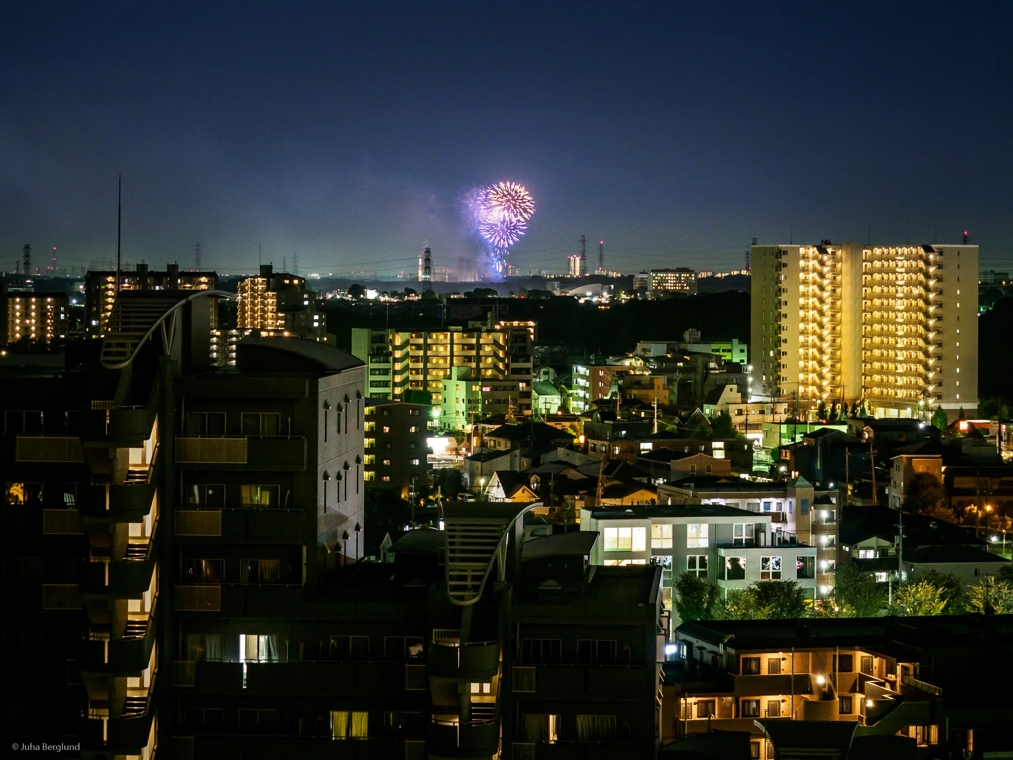 Autumn is fireworks season in Japan. Hanabi over somewhere in Saitama.