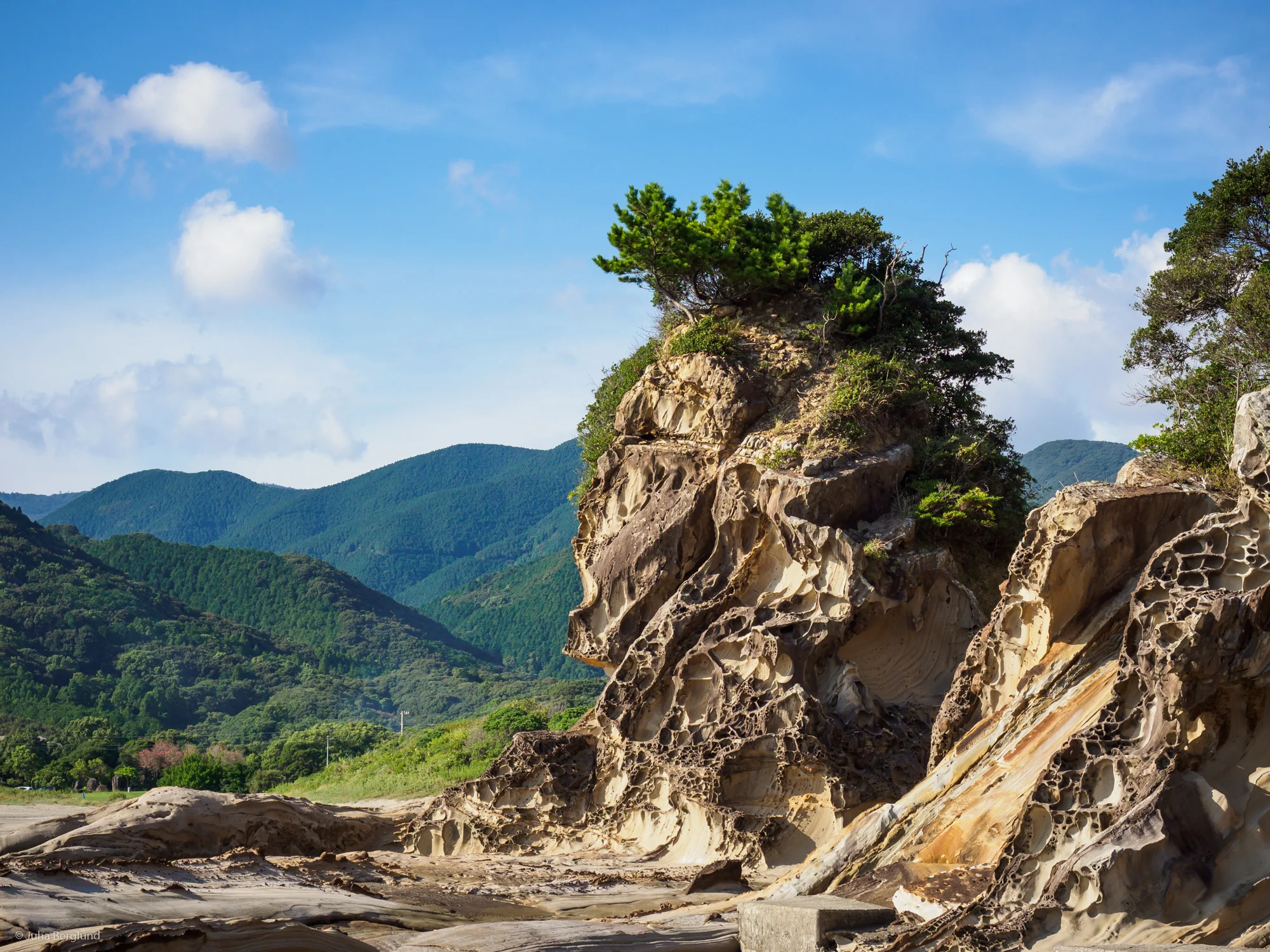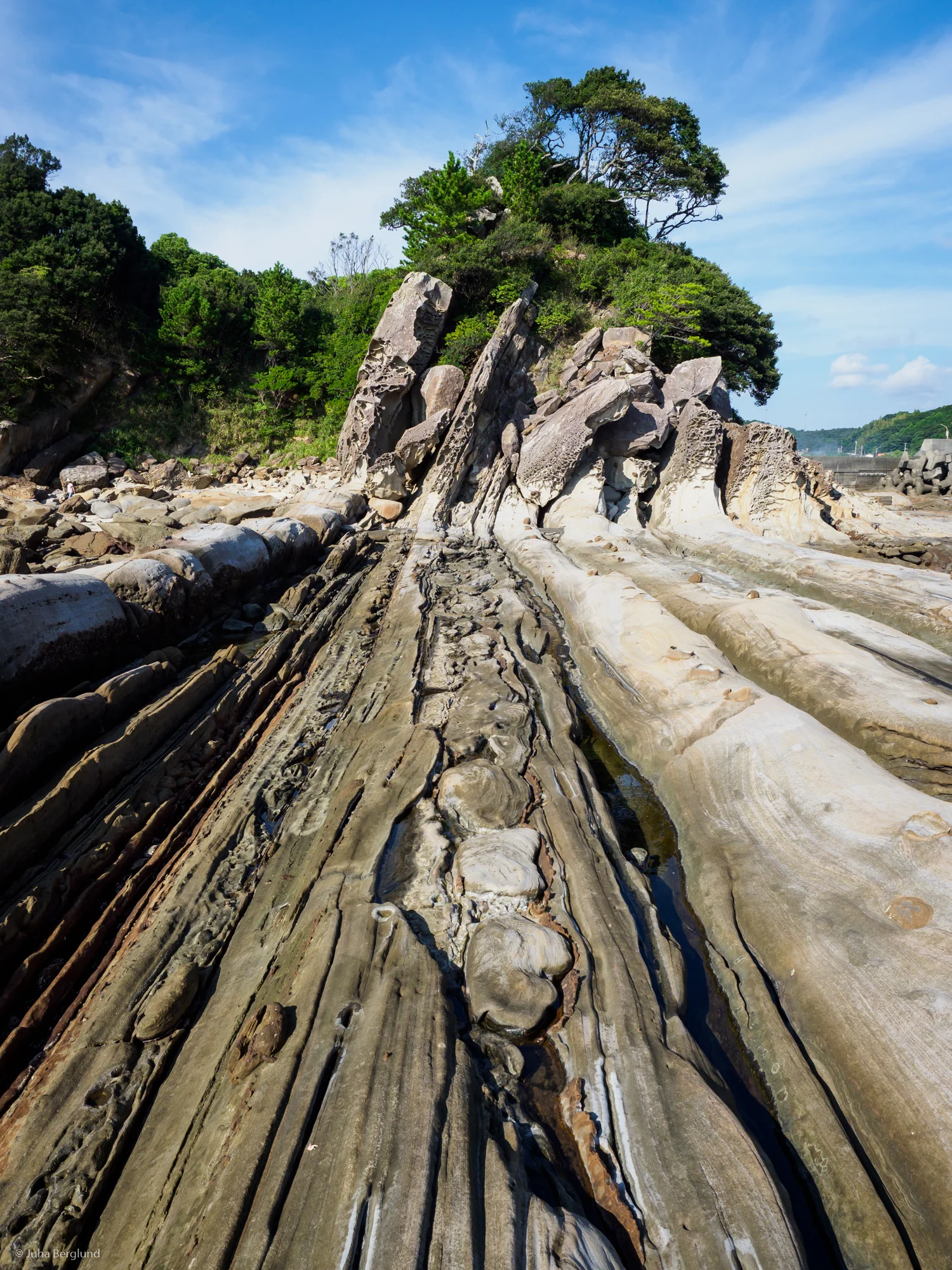 After spending a night along the river, we continued our drive following Shimanto down south. Our next stop was at Kashiwajima, the southwestern end of Shikoku. It is incredible how clear the seawater was! We enjoyed a delicious lunch and after that we drove up to Ōdō observatory to view the scenic Ōdō coastline. We also hiked to a nearby monkey park but unfortunately it was off-season, so the only monkey in the park was pale, old and wrinkly: me. Last stop before reaching our final destination was Tatsukushi coast, where we surveyed some genuinely strange rock formations.